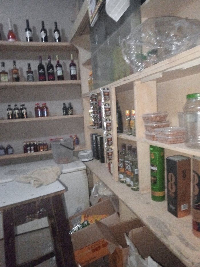 A cluttered storage area displays shelves laden with various bottled beverages, from wines and liquors to smaller bottles