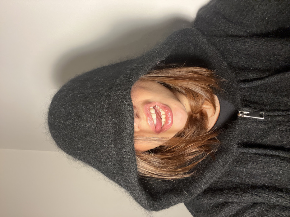 A person in a dark gray hooded coat is upside down. The hood is large and fuzzy. The person's mouth is open, tongue sticking out. Brown hair peeks out from under the hood. A small, silver zipper is visible on the coat's front, near the collar. The background is a plain, light-colored wall.