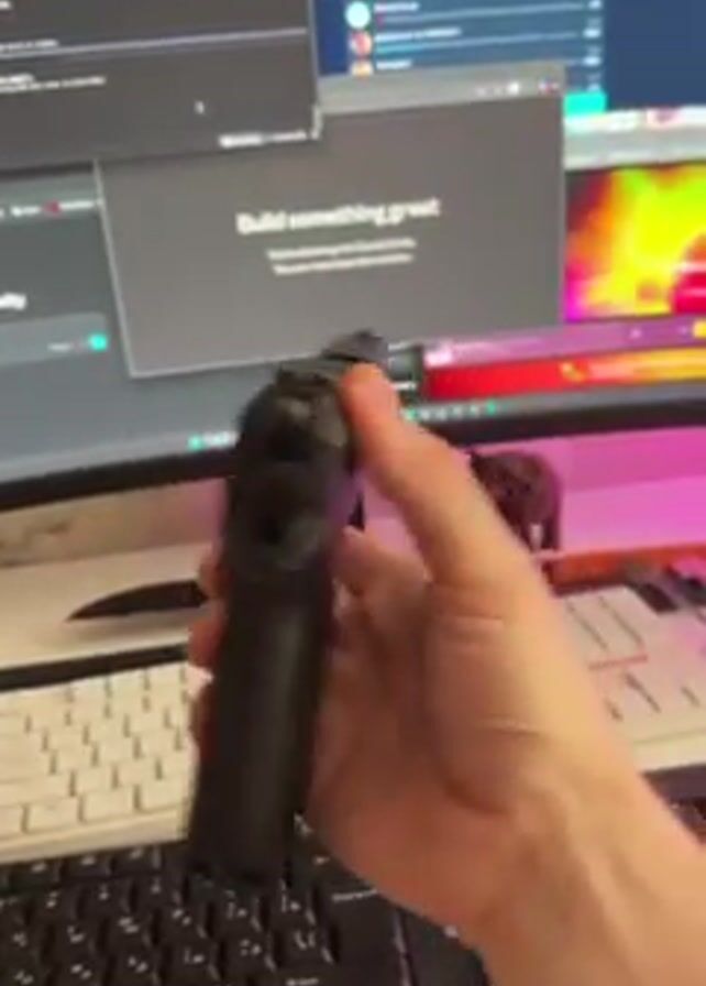 A person is holding a black handgun. The handgun is held in front of two keyboards, a white one and a black one. There are two computer monitors in the background, displaying various windows and websites. The person rotates the handgun in their hand, showing different angles. They then remove the magazine from the gun.