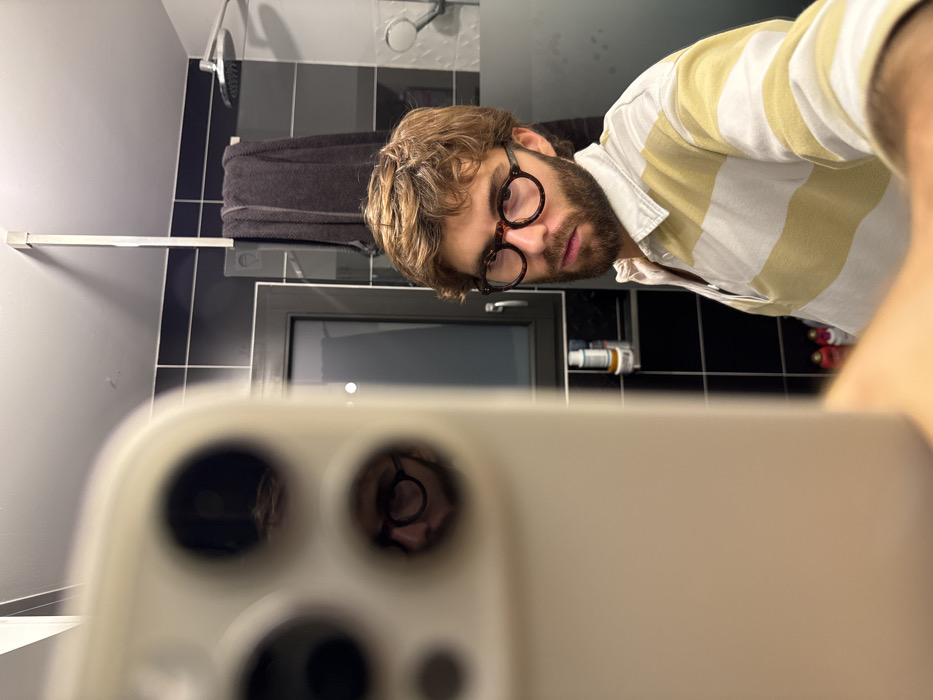 The image depicts the interior of a residential bathroom. An adult male subject is shown from the chest up, reflected in a mirror, actively taking a selfie. He has light brown, wavy hair, a full beard, and wears round tortoise-shell framed glasses. His attire consists of a light-colored polo shirt featuring horizontal yellow stripes. His gaze is directed towards the camera lens. In the left foreground, a white smartphone, with its triple camera array visible, is held by the subject, partially obscuring the scene. The subject's reflection, particularly his face and glasses, is visible in the phone's camera lenses. The bathroom environment includes dark, possibly black or dark blue, rectangular tiled walls with white grout lines, and a white ceiling. In the background, a dark-framed window is visible. Below the window, several personal hygiene bottles are arranged on a shelf. To the right, a dark gray towel hangs on a chrome towel rail, and a chrome shower head is mounted on the wall above it. The precise city of Chambœuf, France, cannot be independently verified from the visual information provided within the image.