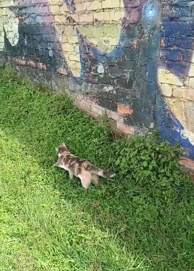 cat walking in a grassy area alongside a brick wall covered in graffiti. The cat is brown and white and moves along the wall towards the right side of the frame. Above the wall, a chain-link fence is visible. The sky is cloudy. The grassy area consists of green grass and some weeds.