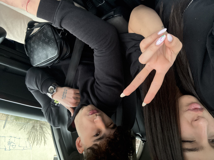 The image depicts two individuals inside a vehicle in Vratsa, Bulgaria. In the foreground on the left, a female with long, dark hair is shown winking with her left eye and pouting her lips. She wears a dark top, and her left hand is raised, forming a 'peace' sign with long, light-colored, decoratively painted fingernails. To her right, a male with dark, curly hair is seated, wearing a dark hooded sweatshirt and a seatbelt. He is also making a pouting expression with a slight squint in his left eye. On his left wrist is a silver wristwatch and a tattoo on his inner forearm. A black Louis Vuitton monogram shoulder bag rests on his lap, and a red string is tied around his right wrist. He wears light-colored trousers. Through the vehicle's window, bare tree branches and a light-colored wall with dark graffiti markings are visible, suggesting an urban outdoor setting.