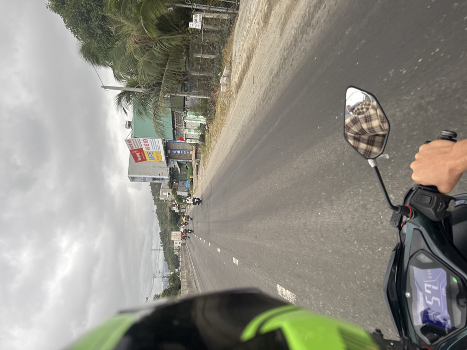 A first-person perspective from a moving motorbike on a straight, paved road. Other motorbikes are visible in the distance. Buildings and vegetation line the road's edge, obscured by overcast skies. The motorbike's instrument panel displays "57". The rearview mirror reflects the rider's plaid-patterned clothing. A hand grips the handlebar. Part of the helmet is visible at the bottom of the frame.