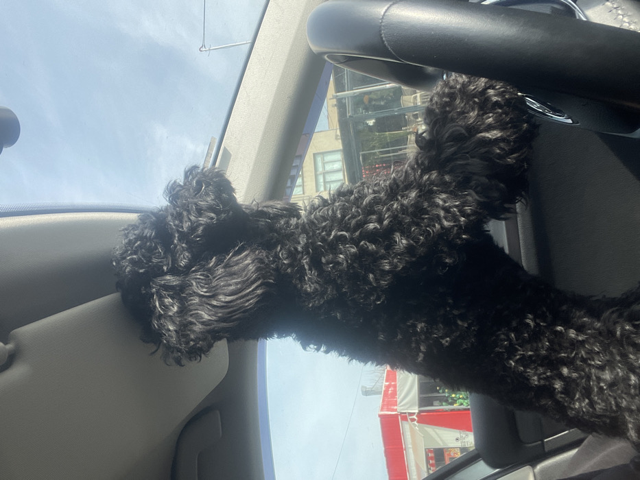 - "A black, curly-haired dog stands on its hind legs in the front passenger compartment of a vehicle, with its front paws resting on the lower windshield frame" by FM-ubWSm1, licensed under CC BY 4.0