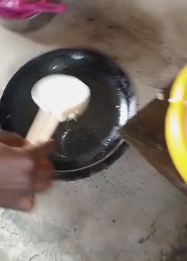 person pouring a white liquid from a yellow bucket into a black frying pan. The pan is on a grey, slightly textured surface. The person uses a yellow scoop to spread the liquid evenly in the pan. There is another empty black pan visible in the lower part of the frame, and a silver bowl covered with a pink plastic bag in the background.