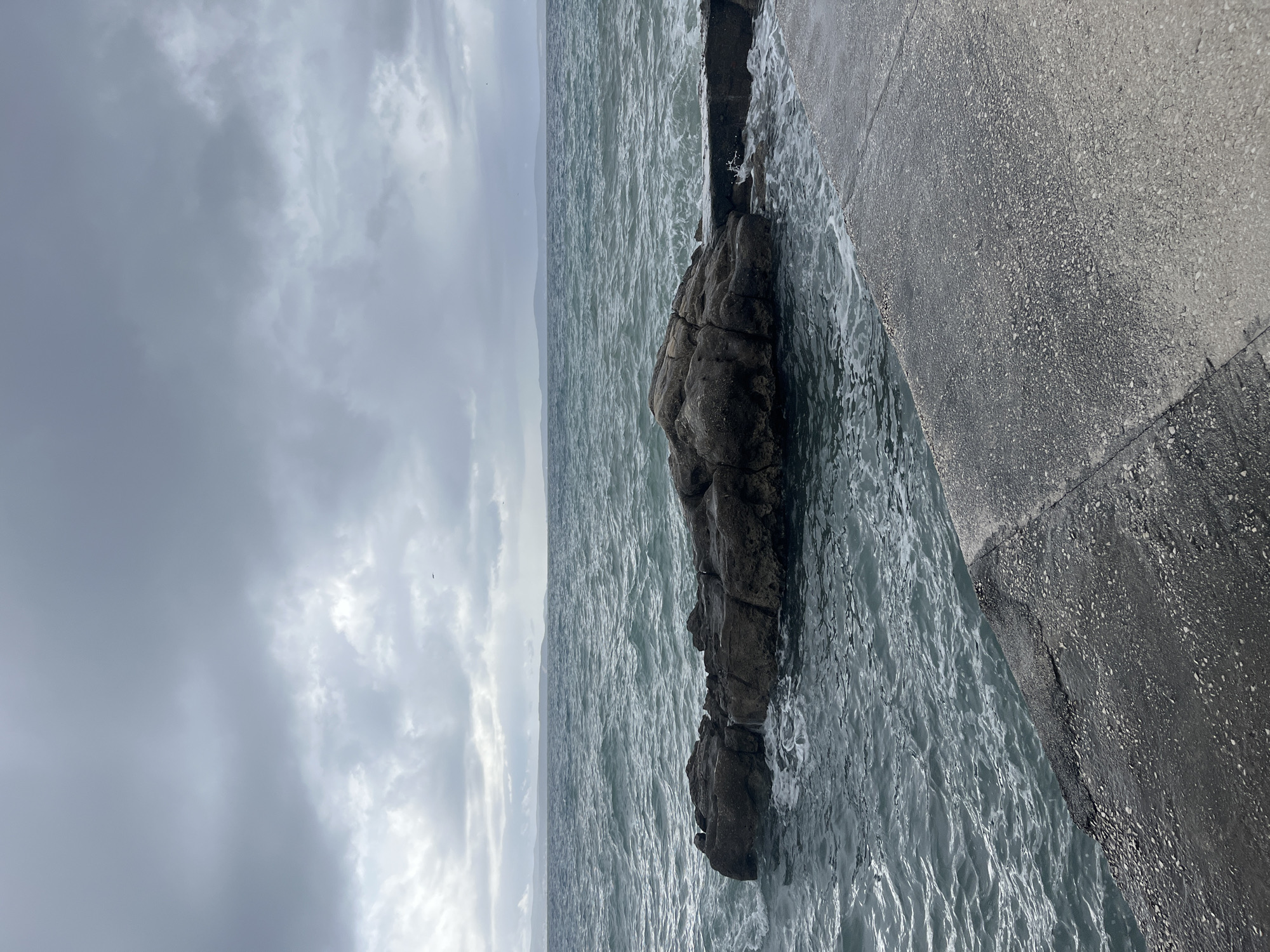 The image displays a coastal scene in Split, Croatia, under a predominantly overcast, grey sky. The foreground features a grey concrete pier or seawall, extending from the bottom right corner towards the lower left, its surface textured with small aggregate and appearing damp at the water's edge. Adjacent to the concrete structure and extending into the midground is a cluster of dark, rugged rocks partially submerged in the water. The sea is characterized by choppy, dark turquoise-grey water with visible white foam from active wave crests breaking against the rocks and the concrete. In the background, distant, low-lying landmasses or islands are faintly visible along the horizon beneath the heavy cloud cover. A small, dark, indistinct object, possibly a bird, is present in the upper-left portion of the sky. No human figures or discernible man-made objects other than the concrete structure are present.