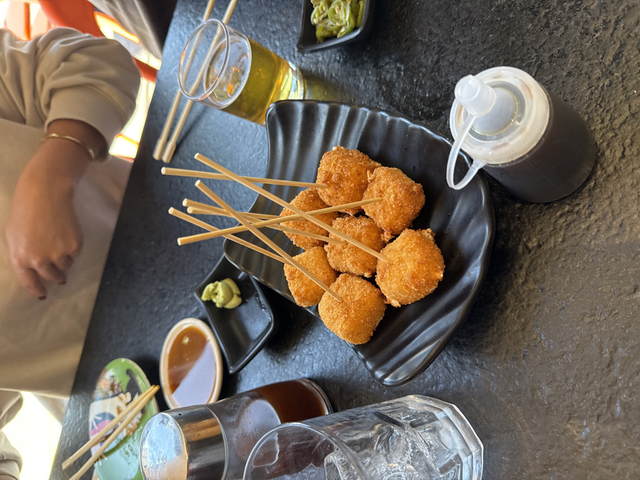 A partially visible person sits at a table with a variety of Japanese appetizers. Beer, a small dish of wasabi, and fried balls on wooden skewers are on a black plate. A soy sauce dispenser and a dipping sauce are nearby. Chopsticks rest on a green and white chopstick holder. An empty glass sits at the bottom of the frame. The table has a dark, textured surface.
