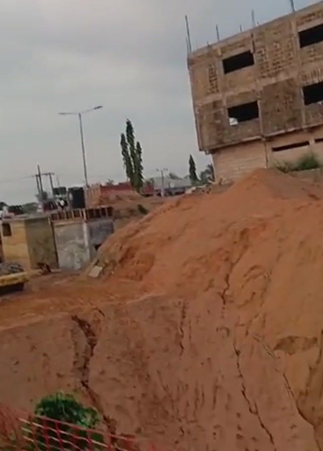 The video depicts a construction site during daylight hours. The site features a large excavation bordered by mounds of reddish-brown soil. Several pieces of heavy machinery, including an excavator and a compactor, are present on the site. Concrete structures and unfinished buildings are visible in the background, as well as residential houses and palm trees. A red safety fence runs along the edge of the excavation to cordon off the area. The sky is overcast, suggesting either early morning or late afternoon lighting.