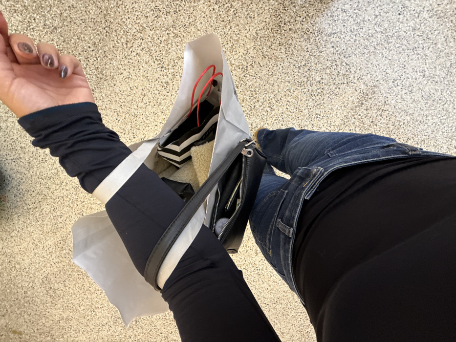 An overhead, angled image captures a person standing on a speckled, light-colored floor, consistent with an indoor commercial setting, potentially a shopping mall, in Saint-Laurent-du-Var, France. The individual wears blue denim jeans and a dark, presumably black, long-sleeved top, layered beneath another dark long-sleeved garment on the left arm. This outer garment features a thumbhole cuff and a prominent white stripe on the upper arm. The left arm carries a white paper shopping bag containing a black and white striped item, a red cord, and a cream-colored, textured material resembling faux fur or fleece. A black shoulder bag with a silver-toned zipper is also carried on the left arm. The visible left hand displays manicured nails with a dark, possibly iridescent or glittery, polish.