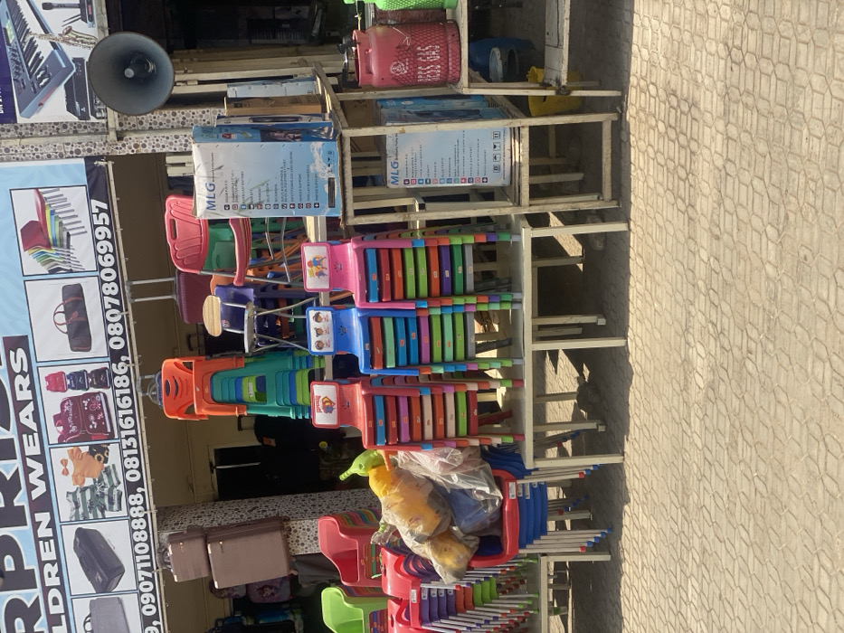 This image captures an outdoor merchandise display in Shaba, Nigeria, under bright daylight