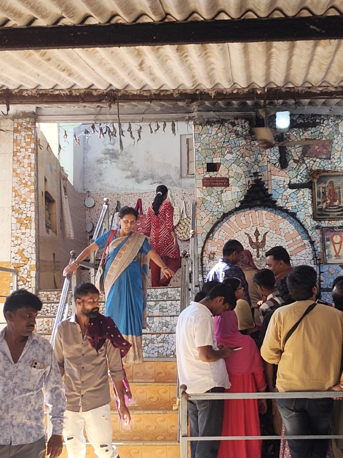 This image captures a bustling interior scene within a religious complex in Veraval, India, likely a temple. The view is partially obstructed by an overhead corrugated roof, supported by dark metal beams. **Environment:** The structure features walls extensively decorated with mosaic tiles in varied colors including white, blue, green, brown, and orange. A prominent wall on the right displays a large mosaic design incorporating a trident (trishul) symbol, with a framed image of a deity mounted above it. Below the trident, a ceiling fan with spinning blades is visible, along with a solitary light bulb. Another section of the wall to the left of the trident mosaic has a small, recessed shrine-like feature. Stairs, tiled with alternating patterns (some greenish-white, others orange-yellow), lead to different levels within the complex. Metal railings line these stairs. In the background, past an open archway, an older, worn wall with peeling paint is visible. A string of dried leaves or similar ritualistic items hangs horizontally from an overhead beam. Various bags are seen hanging in the background area. **People:** Approximately 15-20 individuals, predominantly adults of South Asian ethnicity, are present. * **Foreground Left**: A man in a patterned short-sleeved shirt stands, looking towards the left. Below him, a man with a beard and mustache, wearing a light brown collared shirt and white pants with a maroon scarf draped over his left shoulder, descends the stairs while looking downwards. * **Mid-ground Left**: A woman in a vibrant blue sari with a gold border descends the stairs, holding the metal railing with her right hand and extending her left arm for balance. She looks towards the viewer. Behind her, partially obscured, another woman in a red and white patterned dress or sari is ascending the stairs. * **Mid-ground Right/Background Right**: A cluster of people congregates. A man in a white t-shirt stands, looking down at a smartphone in his hands. Adjacent to him, a woman in a long pink garment stands. Several other individuals, mostly men in casual shirts (including light brown, yellow, and blue), are seen standing or moving. One man in a light brown shirt has a dark strap diagonally across his back. Another man with a mustache is visible further back in the group. The overall scene depicts a functional, active religious space with individuals moving between different levels and congregating, suggesting a typical day for visitors or devotees.