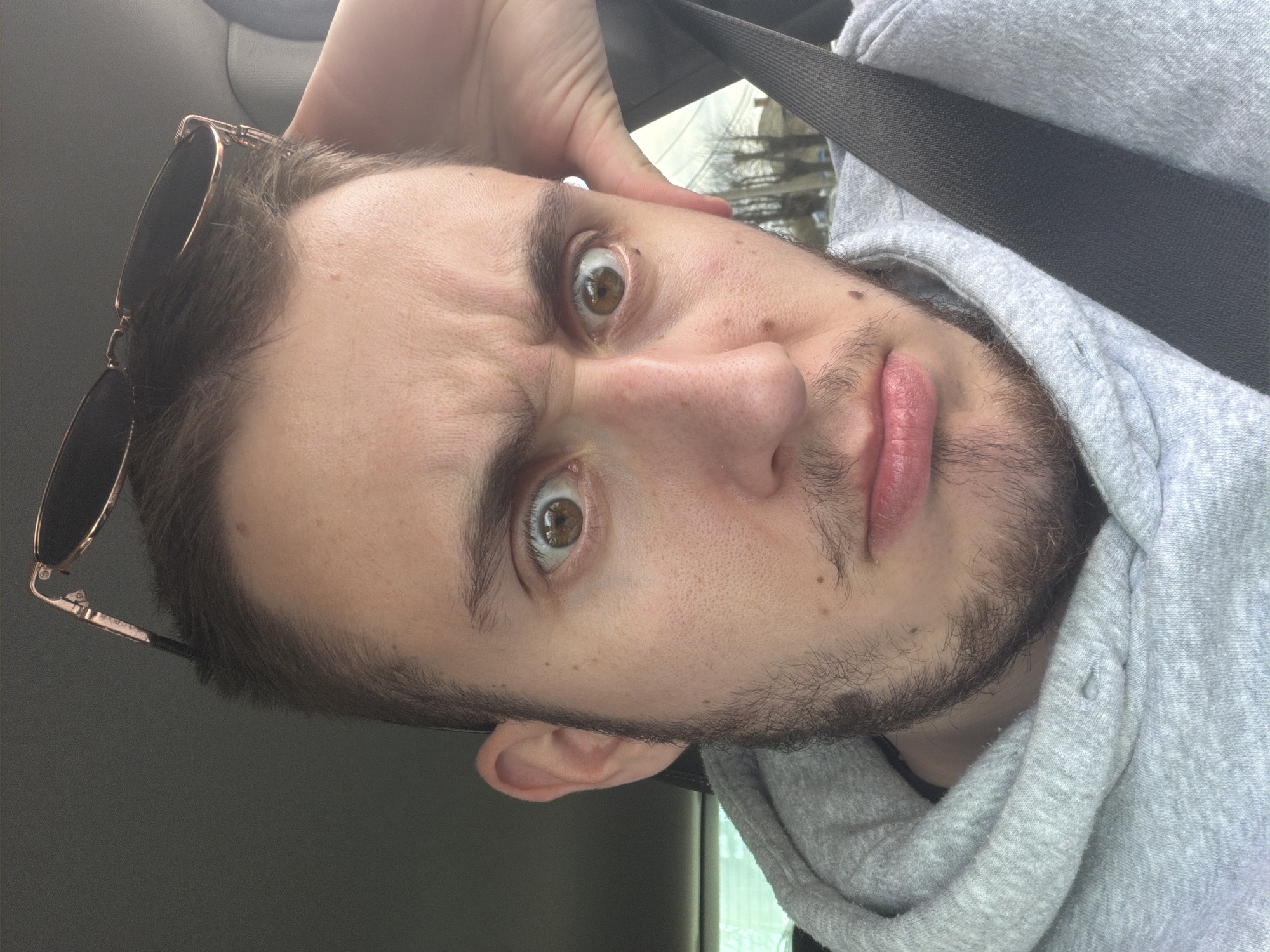 A close-up, slightly angled, selfie of a man with light skin and brown hair wearing a gray hooded sweatshirt and a black seatbelt