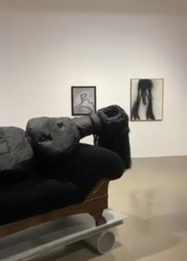 n art installation in a gallery. In the foreground is a sculpture of a black, textured figure lying on a dark-colored couch with wooden legs. The sculpture’s head is obscured with hair, and its neck is circled by a darker material resembling a snake or rope. The couch rests on a low platform supported by cylindrical objects, possibly pipes. In the background, on a white wall, are two framed art pieces with abstract designs. The gallery floor is a smooth, light color. The camera slowly zooms in on the sculpture.