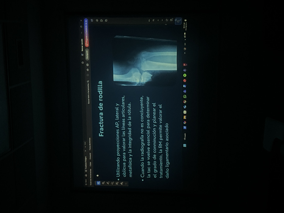The image displays a projected digital presentation on a screen within a dimly lit indoor environment, specifically identified as Interlomas, Mexico. The central subject is a medical slide titled "Fractura de rodilla" (Knee fracture), presented in Spanish. The slide features two bullet points describing diagnostic methods for knee fractures, including the use of AP, lateral, and oblique X-ray projections, and the roles of CT scans and MRI for assessing comminution and ligament damage. To the right of the text, a monochrome X-ray image of a human knee is visible, clearly depicting a fracture in the lower portion of the femur or upper tibia, characterized by significant displacement. The projection includes elements of a web browser interface at the top, showing tabs with "Fracturas Imágenes" and a search bar. At the bottom of the projected image, a Windows operating system taskbar is present, displaying various application icons and the system clock indicating "9:29 AM" on "11/08/2023." The immediate surroundings are dark, with a dark ceiling visible at the top of the frame. No individuals are present or discernable in the scene.