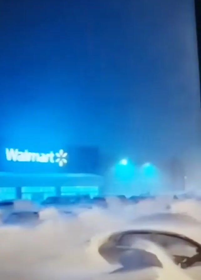 heavy snowstorm. The first clip shows a group of people walking along a shoveled path next to a snow-covered parking lot. A car is visible with heavy snow cover. A streetlight illuminates the scene. The next clip shows a wide shot of a Walmart parking lot covered in snow, making the vehicles appear almost completely buried. Streetlights dot the horizon under a blue sky. The final clip shows a person walking in a shoveled path, surrounded by high snowbanks, with the Walmart building visible in the background. The snowstorm seems severe, hindering visibility.