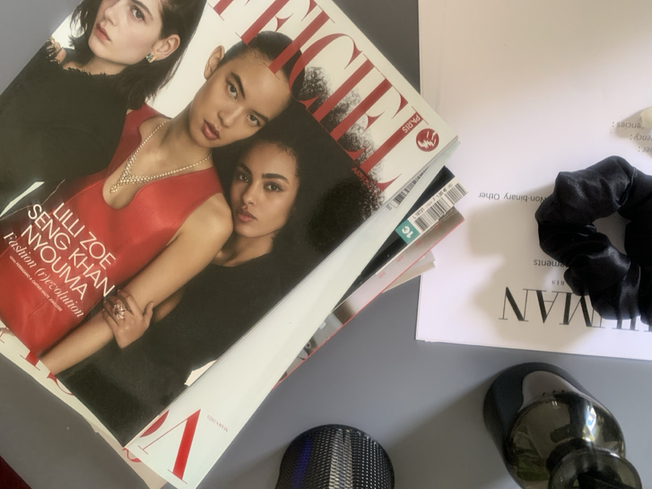 The image displays an overhead view of a desk or table surface in the city of Paris, France. A stack of magazines is centrally positioned, with the top magazine identified as 'ELLE PARIS' from March 2023. The cover features three women; one prominent figure wears a red garment, a diamond-like necklace, and a ring on her left hand. Text on the cover includes 'LILLI ZOE', 'SENG KHAN', 'NYOUMA', and 'Fashion (r)evolution'. To the upper left, a black mesh desk organizer is visible. In the lower left, a dark, reflective object, possibly a small vase, rests on the surface. Beneath the magazines, several white papers are partially visible, one displaying text fragments like 'MAN' and 'Non-binary Other'. A black scrunchie lies in the lower right portion of the frame.