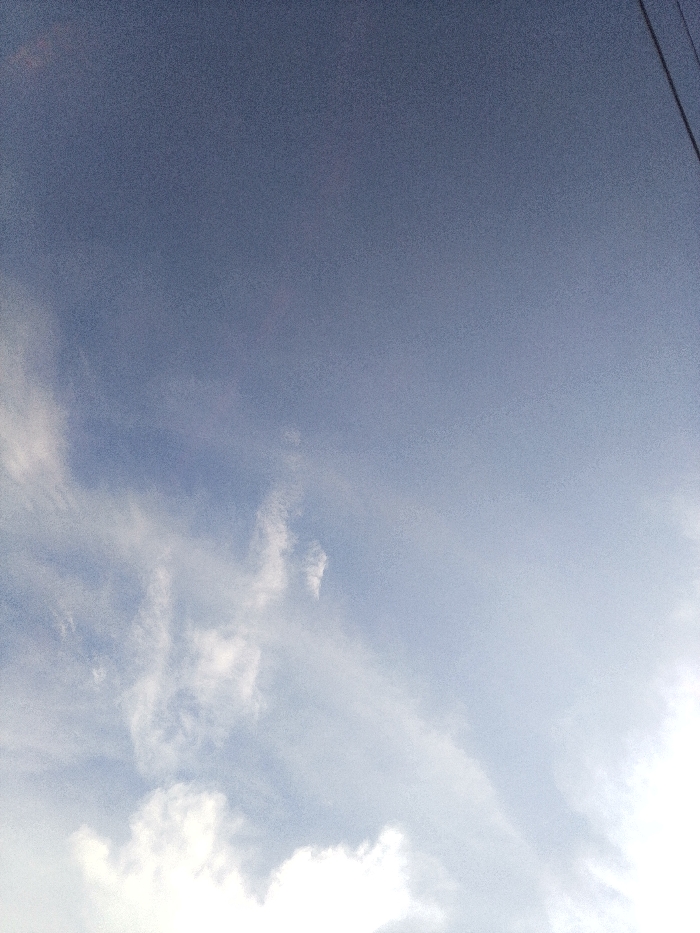 The image displays an outdoor sky scene, predominantly filled with varying shades of blue, grey, and white