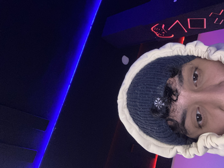 A person's face wearing a blue beanie with a white snowflake design, and a cream-colored hood around their head. The background features a dark space with blue neon lights along the edge of steps or walls, and red neon symbols of a dice, triangle, square, and the PlayStation logo on a higher surface. The image is rotated to the right.