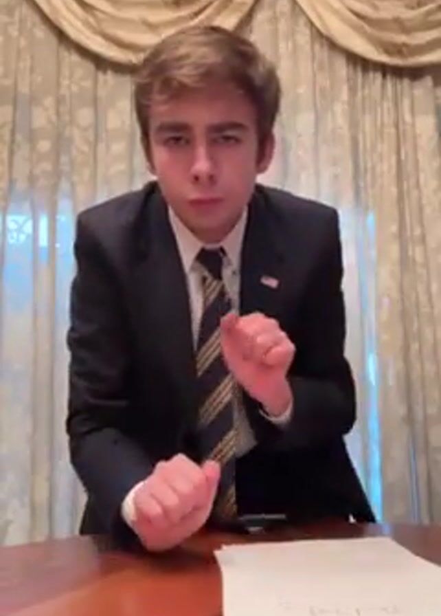 A young man in a suit, tie, and American flag pin is standing behind a wooden table with papers on it. He is moving his hands like he is playing a small keyboard and bobbing his head to the beat of Latin dance music. There is a curtain behind him.