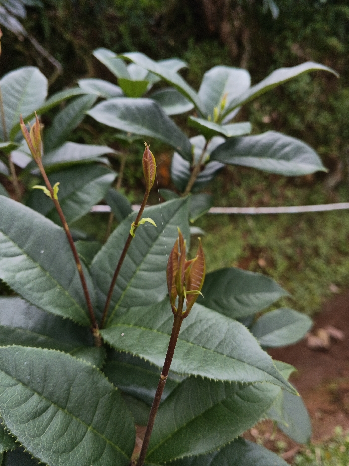 A close-up photograph captures new growth on a plant in the city of Unknown, Vietnam. The foreground displays several dark green, mature leaves exhibiting serrated margins and prominent venation. Three distinct young shoots emerge vertically; each features reddish-brown, elongated terminal buds that transition to light green at their bases. A fine, white spider silk strand is visible, extending diagonally between two of the upper shoots. The background consists of blurred green foliage and reddish-brown earth, with a faint lighter horizontal line present in the upper right. No individuals or active subjects are depicted.