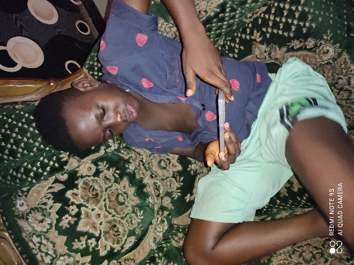 An indoor setting in an unidentified location. A young male is seated, angled to the left, with dark skin and short dark hair. He wears an unbuttoned dark blue short-sleeved shirt with red strawberry patterns and light green shorts. He holds a light-colored smartphone horizontally with both hands, his head tilted down, eyes focused on the device. He rests against a green fabric surface patterned with gold/tan floral and avian designs, likely an upholstered sofa or chair. A segment of a light-colored wooden chair frame is visible in the upper right background, against a dark wall featuring white circular motifs.