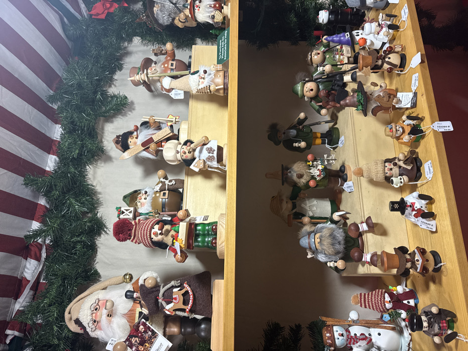 Two shelves display wooden Christmas ornaments, divided by a vertical wooden panel. The left shelf features ornaments of Santa Claus, skiers, and chefs, set against a backdrop of a red-and-white striped curtain and green garland. The right shelf contains ornaments depicting hunters, snowmen, and various characters in traditional attire. Price tags dangle from several ornaments. The scene suggests a Christmas market or holiday display.