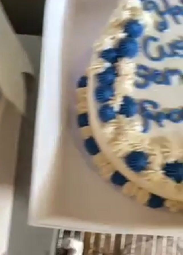 cake in a white cake box, presumably for Customer Service Week, as it is written on the cake with blue icing