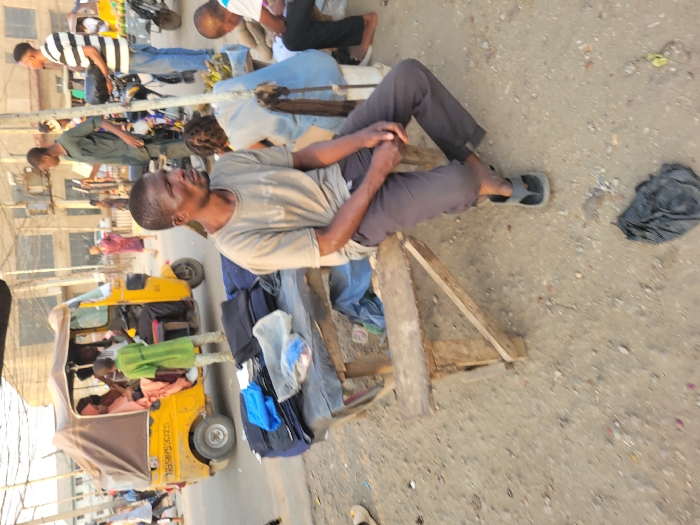 A man sits on a makeshift wooden seat outdoors, wearing a tan shirt, dark pants, and sandals. Clothing items are draped around him and on the ground nearby. Behind him, a yellow motorized rickshaw is visible, along with other people. The surrounding area appears to be a busy street or market.