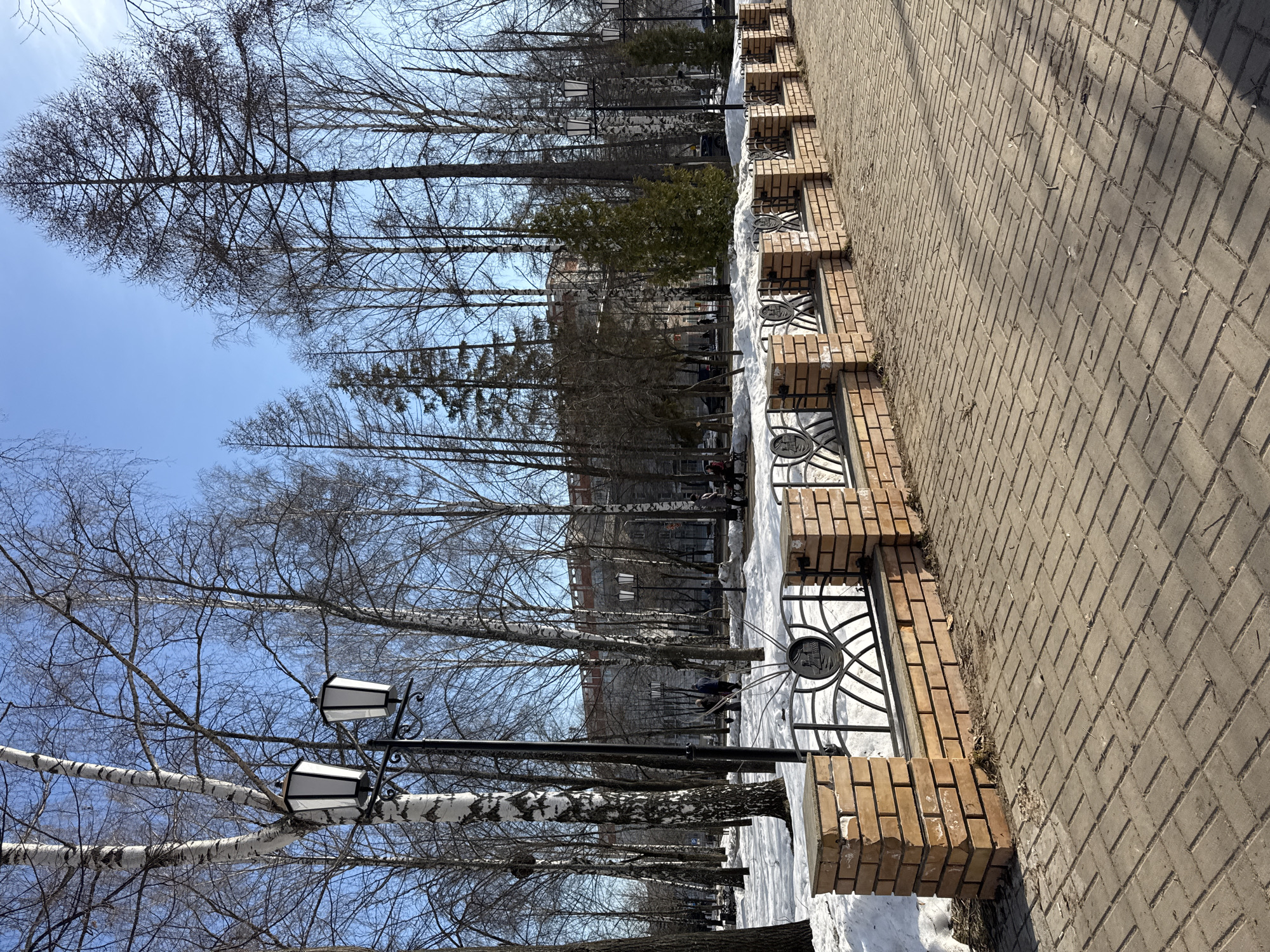 street scene in Chaikovsky, Russia, likely during late winter or early spring. A brick-paved walkway dominates the right side of the frame. To the left of the walkway is a decorative brick and metal fence, partially obscured by patches of snow. Beyond the fence are bare trees, including birches with their distinctive white bark, and some evergreen trees. A few people can be seen in the background, walking and sitting on benches. Lampposts are visible amidst the trees on the left. The sky is blue with sparse clouds. The overall impression is of a public park or pedestrian area in an urban setting.