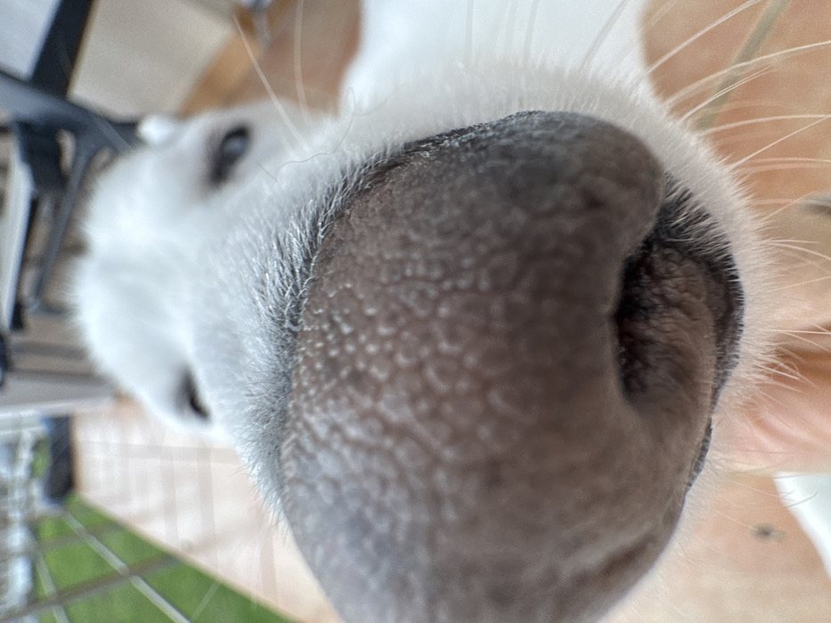 - "The image displays an extreme close-up, low-angle perspective of a white-furred dog's snout, located in Polje, Montenegro" by FM-vBqzm1, licensed under CC BY 4.0