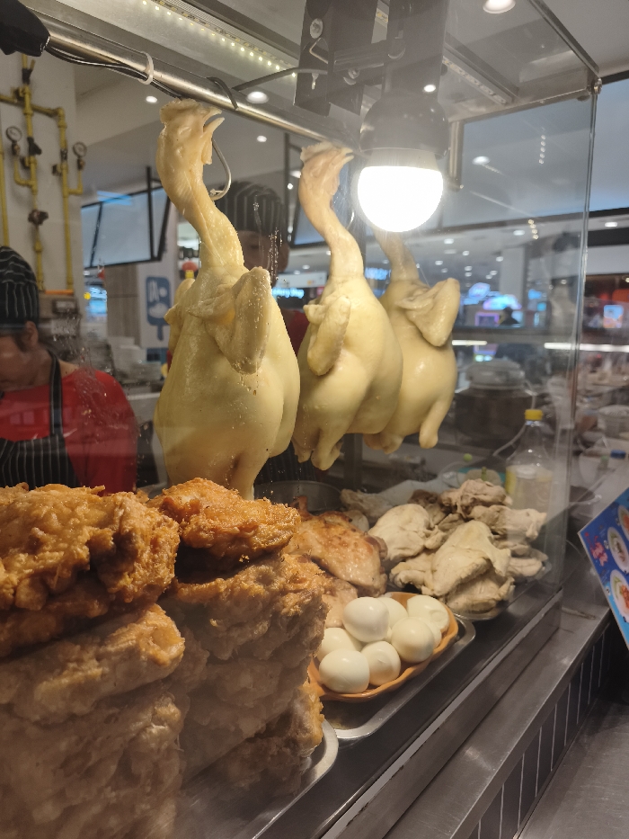 A display case showcases food. Three whole boiled chickens hang by their necks under a bright light. Below, a stack of golden fried chicken sits beside cooked chicken pieces and a tray of boiled eggs. A person in a red shirt and a black and white hat stands behind the chickens, seemingly working in the food establishment. A bottle and some other items can be seen in the back of the display case.