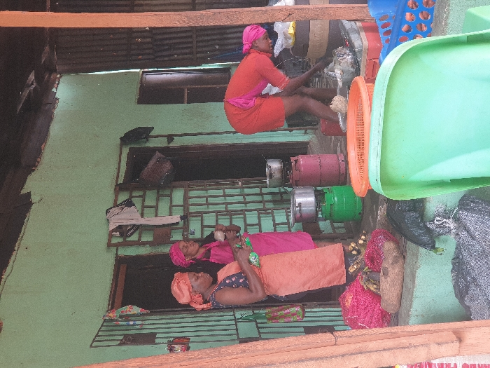 This image captures an outdoor food preparation and cooking scene in Obosi, Nigeria, situated on a raised concrete platform in front of a light-green painted building