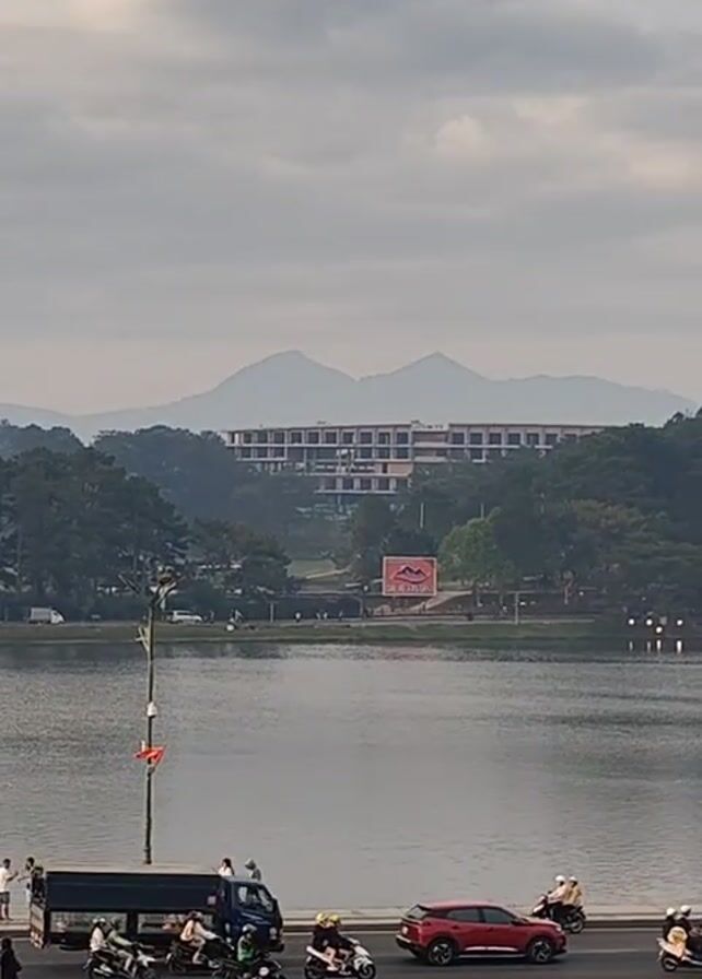 view across a lake to a large building in the distance, with mountains visible behind it. There's a busy road in the foreground with cars, trucks, and motorcycles driving by, and several people are walking on the sidewalk next to the road. The sky is overcast.