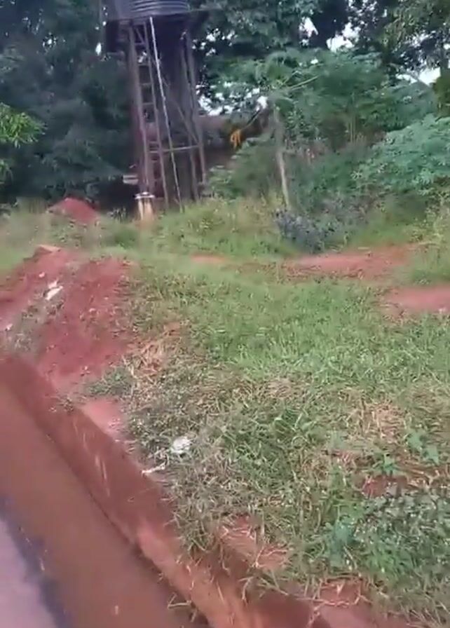 street scene from a slightly low angle. The road is a reddish-brown color and has a concrete ditch running alongside it. Water is present in the ditch. Grass and red dirt are present on the embankment between the ditch and the road. In the background, a water tower stands among trees. As the video continues, the camera pans to the left to reveal people in the distance walking and working along the road. The sky is overcast.