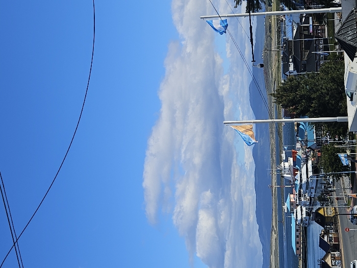 A sideways outdoor shot reveals a vibrant blue sky partially obscured by long, white clouds. Below the sky is a waterfront area, featuring flags waving from masts, docked boats, and buildings along the shore. Hills or mountains are visible in the background, adding depth to the scene. Utility lines stretch across the upper left corner of the sky.