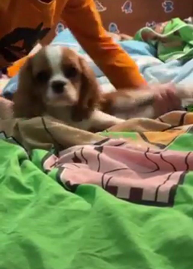 A young boy in an orange long-sleeved shirt kneels on a bed and pets a Cavalier King Charles Spaniel puppy. The bed is covered with colorful sheets: green, red, pink with a brown pattern, and blue with images. The boy gently holds the puppy, turning it slightly, while the puppy licks his hands. A headboard can be seen in the background.