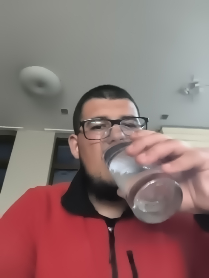 An indoor photograph, captured in Panichishte, Bulgaria, depicts a male individual from the chest up. The subject has short dark hair, a beard, and wears dark-framed eyeglasses. He is dressed in a red zip-up jacket with a black collar. He holds a clear glass containing a light-colored liquid to his mouth with his right hand, actively drinking. The background features a light-colored ceiling with a circular, white flush-mount light fixture positioned to the upper left. Another less distinct ceiling fixture or fan is visible further to the right. A dark-framed architectural element, possibly a window or door frame, is partially visible behind the subject on the left.