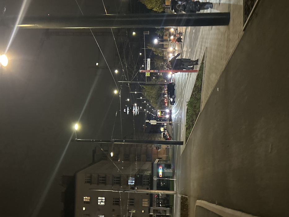 The image depicts an urban street scene at night in Vienna, Austria, specifically near the St. Marx district, identified by a red and white "H St. Marx" bus stop sign. The vantage point is from a paved pedestrian pathway, looking down a city street illuminated by artificial light sources. On the left side of the frame, a multi-story, light-colored building with numerous square windows, some illuminated, is visible. Adjacent to it, at an intersection, a smaller commercial building features a vertical, multicolored light display. Overhead, a dense network of tram or trolley wires spans the scene, supported by multiple utility poles. A large construction crane is faintly discernible in the upper right background. The street surface, which appears wet, contains embedded tram tracks. Vehicular traffic includes a red and white tram approaching in the distance, multiple dark-colored cars, and at least one orange-colored scooter. Traffic lights are visible further down the street. In the mid-ground, near the aforementioned "H St. Marx" sign, two individuals are standing on a paved area adjacent to the street. One person, dressed in dark clothing, is partially obscured by a pole and appears to be holding an object to their ear. The second person is largely obscured behind the first. Further to the right, another individual, wearing a dark coat, walks away from the camera on a paved sidewalk. Indistinct figures are also present on the far-left sidewalk near the main building. A planted median strip with low vegetation separates the pedestrian area from the main road in the foreground.