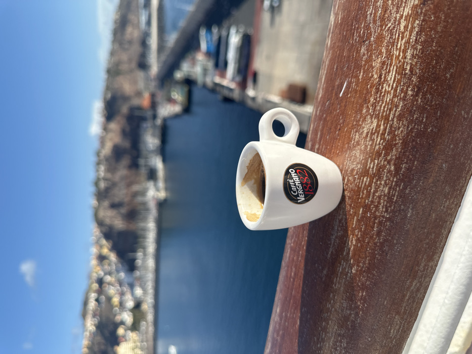 A small, white ceramic espresso cup with a handle, featuring the black oval "Caffè VERGNANO 1882" logo, is positioned on a weathered brown wooden railing. The cup contains a dark liquid, consistent with espresso, with visible residue on the interior rim. The railing is part of an elevated structure, such as a ship's deck or balcony, overlooking the harbor of San Sebastián De La Gomera, Spain. The blurred background features a deep blue body of water, reflecting sunlight. A marina populated by numerous boats and yachts is visible, with a pier extending into the water from the right side of the frame. A city built into a prominent hillside forms the distant backdrop under a clear blue sky. No individuals or explicit actions are discernible.