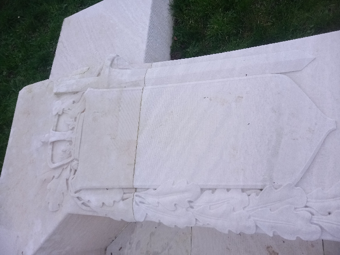 A stone structure features a central blank shield shape, likely for inscription. Above, a carved sword rests horizontally. The shield is framed by detailed carvings of leaves on both sides, suggesting oak or laurel. The stone is light-colored and weathered, set against a background of grass, possibly in a cemetery or memorial garden. The overall impression is one of solemn remembrance.