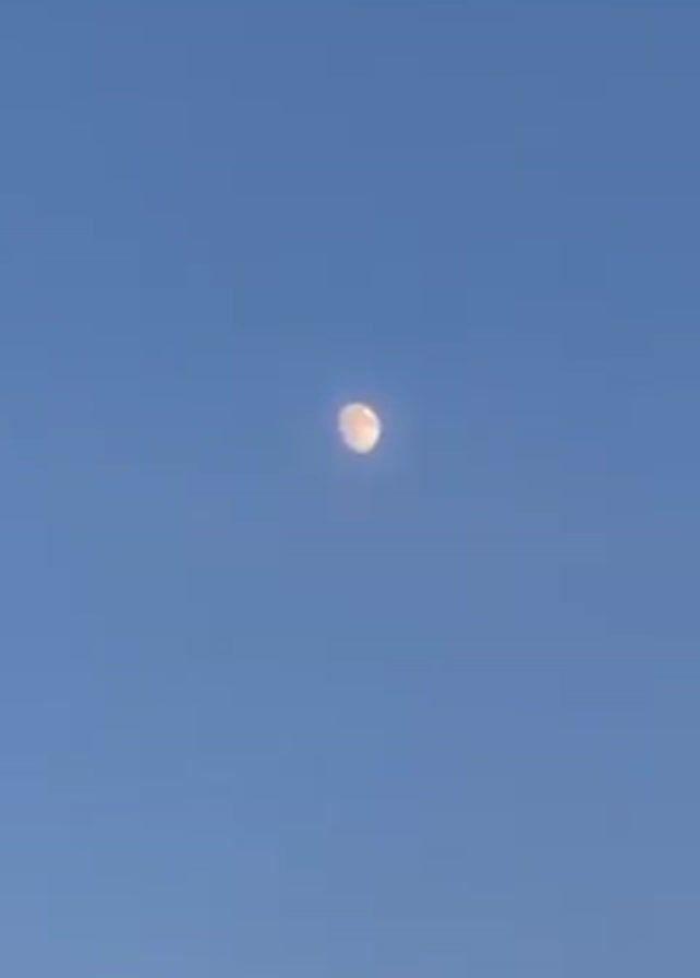 waxing gibbous moon in a clear blue sky. The camera zooms in slightly on the moon. In the bottom of the frame, some treetop foliage is visible.
