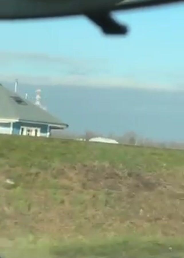car driving on a road in the countryside. On the side of the road, there are grassy hills, trees, a light blue building with a brown roof, and some pedestrians. There is also a light blue truck with a white tarp driving on the hill. The sky is blue with some clouds. The camera is inside the car, and the windshield is visible at the top of the frame. A phone is visible in the lower middle of the frame.