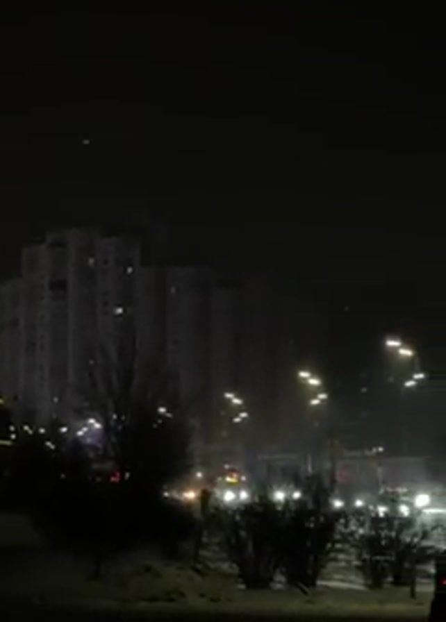night time cityscape scene, with a focus on a busy street. Cars drive along the road, illuminated by streetlights and their own headlights and taillights. Buildings, including a high-rise apartment block, are visible in the background. There is snow on the ground in places. The sky is dark and the overall lighting is subdued. Some signs with text are visible. The camera appears to be in motion, possibly mounted on a vehicle.