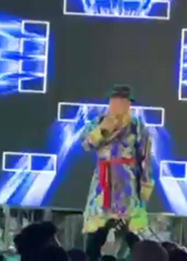 A man stands on a stage, singing into a microphone. He wears a colorful, ornate robe with a red sash, black pants, and a black hat. Behind him is a large screen displaying light patterns and Tetris-like shapes. The lighting changes from blue to purple. An audience is visible in the foreground, slightly out of focus.