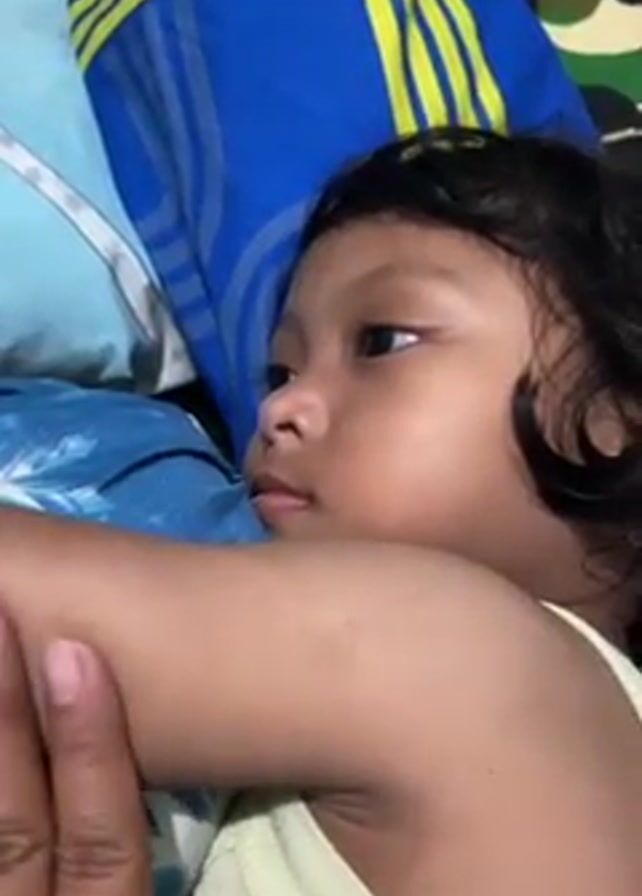 A young girl is lying down, likely in bed, with pillows behind her head. She is wearing a light-colored top and her hair is dark and curly. A dark-skinned hand is gently touching her arm. The girl is looking off to the side with a somewhat serious expression. The pillows have various patterns, including blue with yellow stripes, blue with a wave pattern, and camouflage.