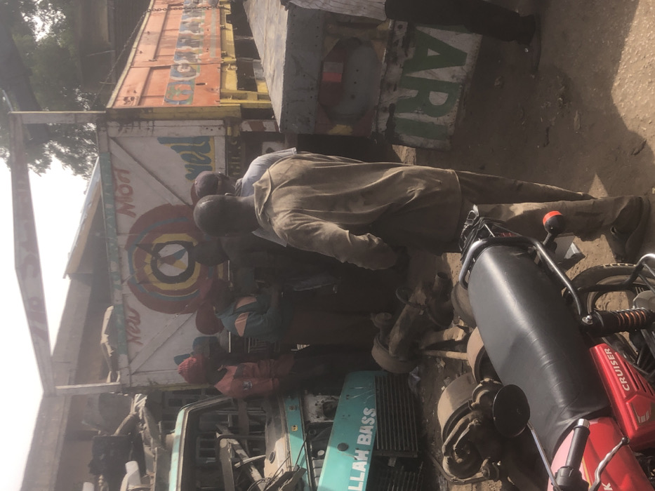 This image depicts an outdoor repair or scrap yard in Kufena, Nigeria, under daylight conditions