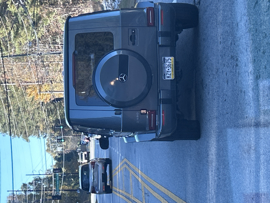 An overhead-view photograph captures a multi-lane roadway in Lawrenceville, Georgia, United States, under clear skies. The primary subject is the rear of a dark gray Mercedes-Benz G 550 SUV, positioned in the right lane. The vehicle displays a Georgia license plate, "KZY-3675," and features a rear-mounted spare tire with a prominent Mercedes-Benz emblem. Reflections of light are visible on the vehicle's rear window and spare tire cover. Ahead in the left lane, a silver SUV is visible, followed by additional vehicles further in the distance. The asphalt road surface is marked with solid double yellow lines to the left and a broken white line to the right, indicating traffic lanes. In the background, power lines are strung across multiple utility poles, and dense clusters of trees with green and some autumnal foliage line both sides of the road. Overhead traffic lights, displaying green signals, are visible, along with a green street sign identifying the intersection as "Graystone Rd / New Hope Rd." The scene is illuminated by direct sunlight. No individuals are clearly visible.