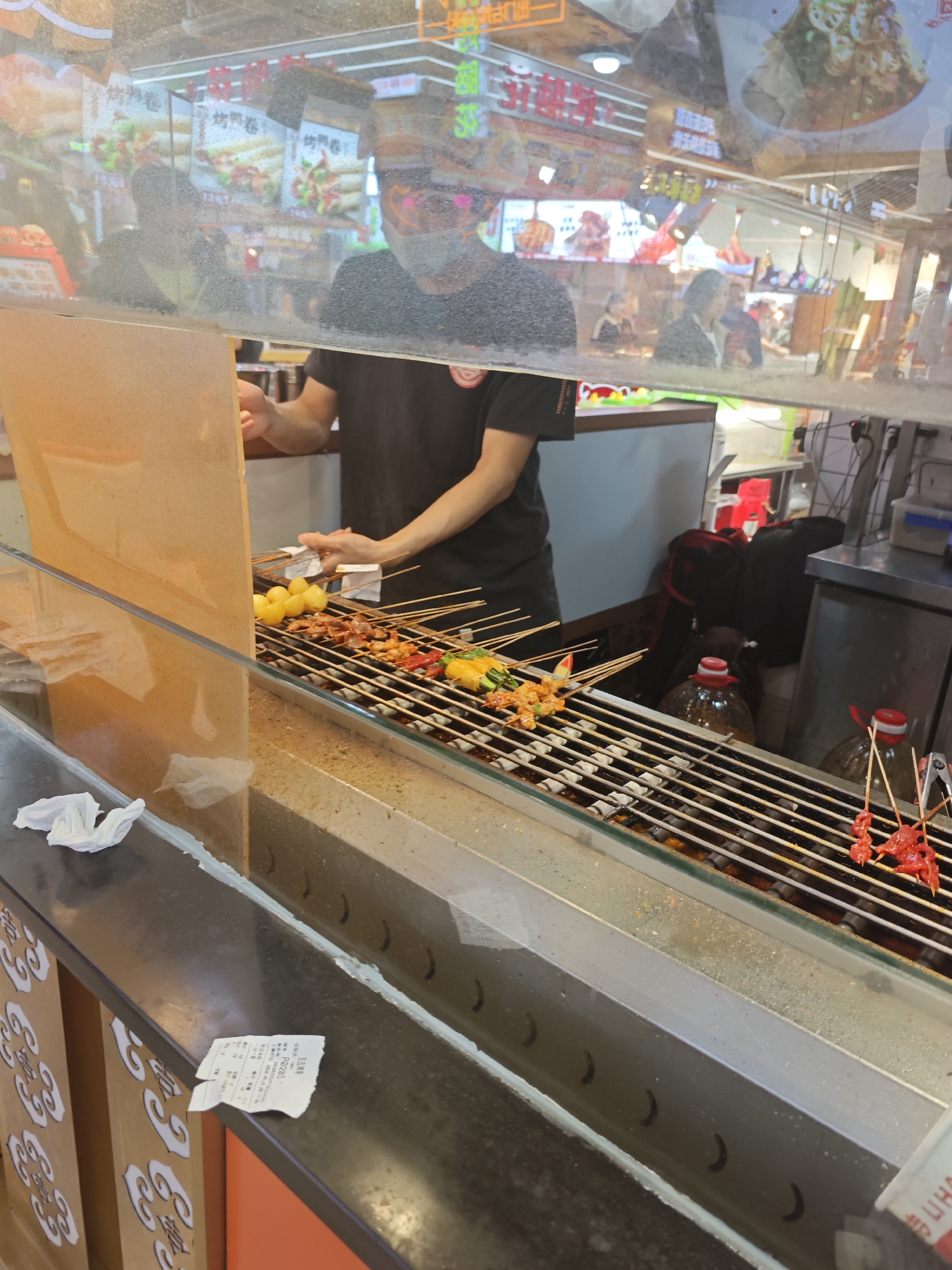 The image depicts a food stall in Liangjiang, China, possibly a street food vendor. A person wearing a mask is behind the counter, handling skewers of food on a grill. The grill contains various foods including what appear to be potatoes, meat, and vegetables. There are bottles near the back of the grill. A countertop surrounds the grill with items such as crumpled tissues and a receipt on the surface. The stall appears to be located in a brightly lit, busy area, potentially a market or food court, as evidenced by the reflections of signs and other people in the glass panels.