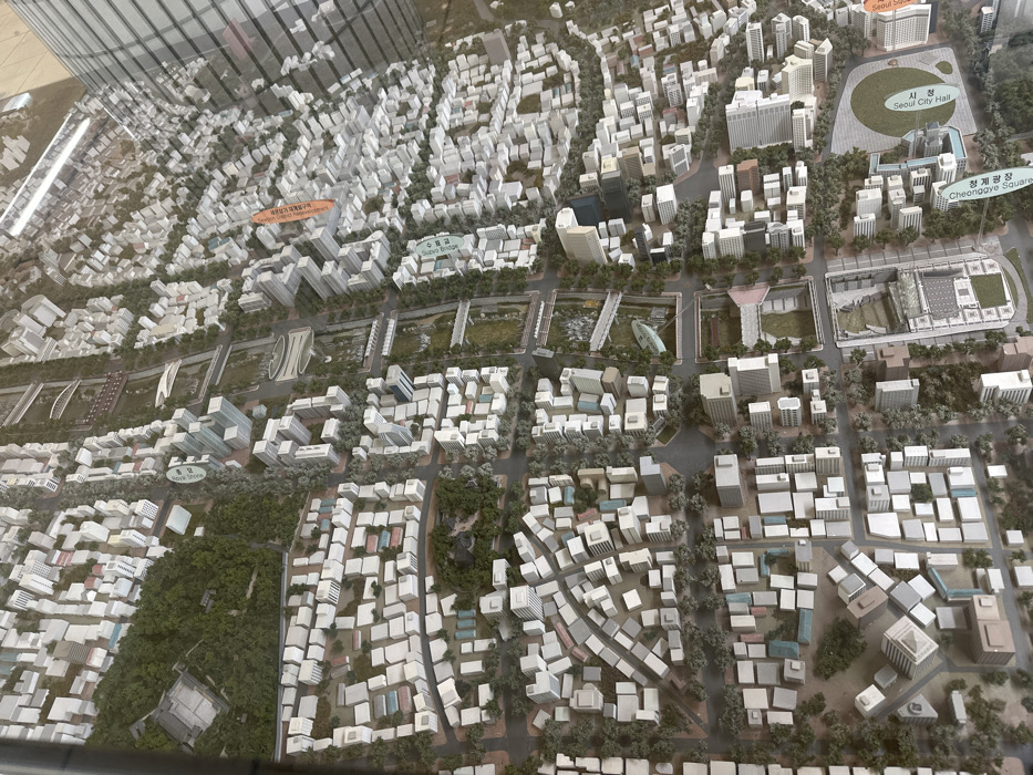 This is a scale model of an urban area with a dense mix of building types, ranging from low-rise residential to taller commercial structures. A green space runs through the center, bordered by the Cheonggyecheon Stream. Features include city hall, a plaza, and identifiable landmarks like the Seoul City Hall. The model highlights the planned urban layout, showcasing the area's architecture and infrastructure.