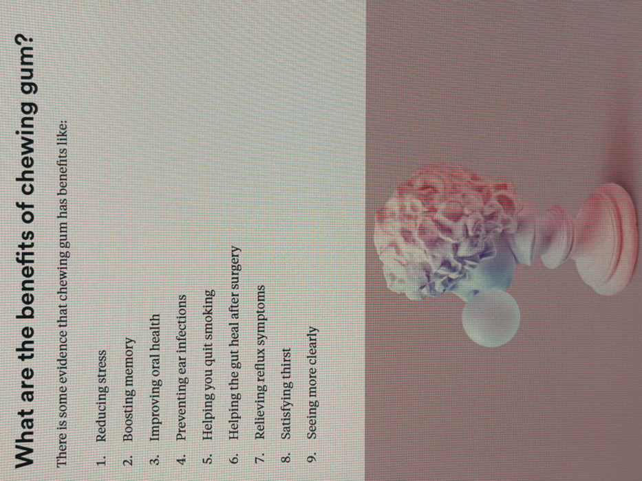 A digital display originating from Son en Breugel, Netherlands, shows a two-part composition. The upper section features black text on a light gray background. A bold heading reads "What are the benefits of chewing gum?", followed by the introductory sentence, "There is some evidence that chewing gum has benefits like:". Below this, a numbered list from 1 to 9 details specific benefits, including "Reducing stress," "Boosting memory," and "Seeing more clearly." The lower half of the display is separated by a distinct horizontal line and presents a still image against a solid reddish-pink background. This image depicts a classical-style bust of a human head, rendered in profile facing left. The bust appears to be made of a light-colored material, showing tones of pale blue on the left side and reddish-pink on the right, consistent with artistic lighting. Intricately carved hair details are visible. The bust is mounted on a decorative, fluted pedestal. A translucent white bubble, consistent with chewing gum, protrudes from the bust's mouth. Pixelation inherent to a screen display is evident throughout the entire image.